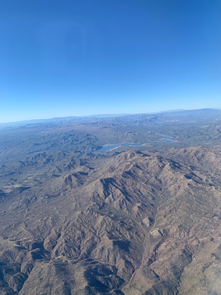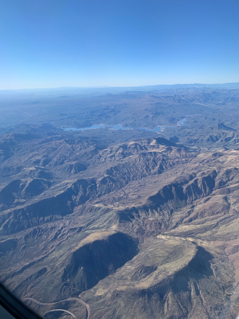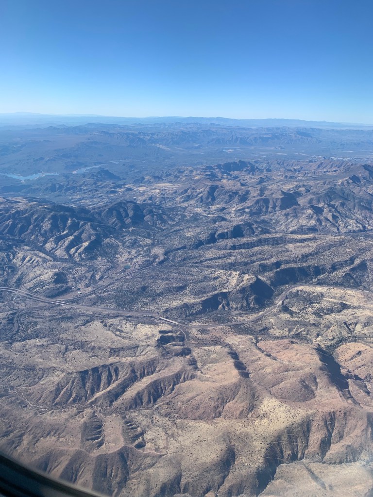 Enjoying free movies for a couple hours before realizing the blinds were down and I was possibly missing purple mountains majesty or some such landscapes. They don’t look purple from way up here, but they are stunning nonetheless.
